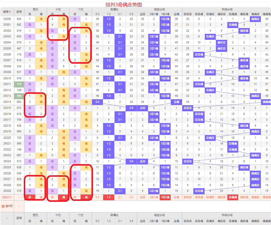上一期的奇偶比为2:1,两奇的号码组合,从近五期的奇偶数出现情况看,奇数出6次,偶数出现9次,奇数号码出现较少,本期要侧重两偶的号码组合,侧重奇偶偶或偶奇偶的号码组合,根据奇偶组合形态可做五码定位13579/02468/02468或02468/13579/02468