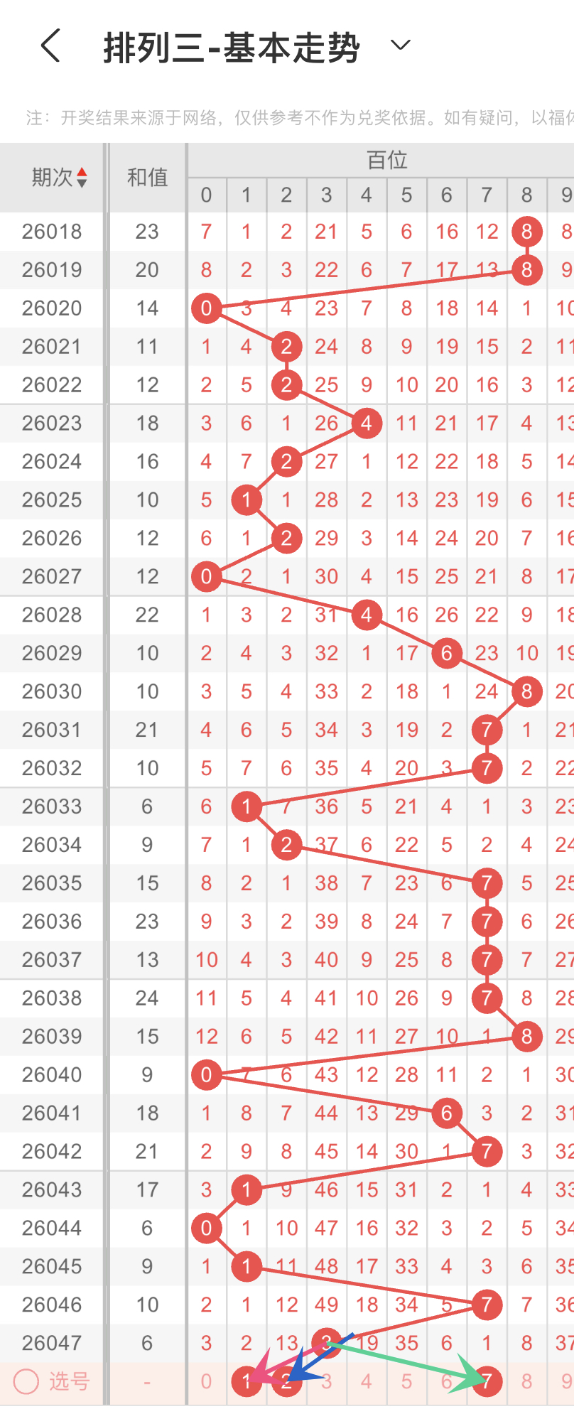 结合上面的大小、奇偶以及012路比,我们可以得到的数据分别是第一组01234,第二组13579,第三组147,我们重点选择3组数据中重复的,那百位我们选择1,防1路的7,2路的2,综上所述百位选127