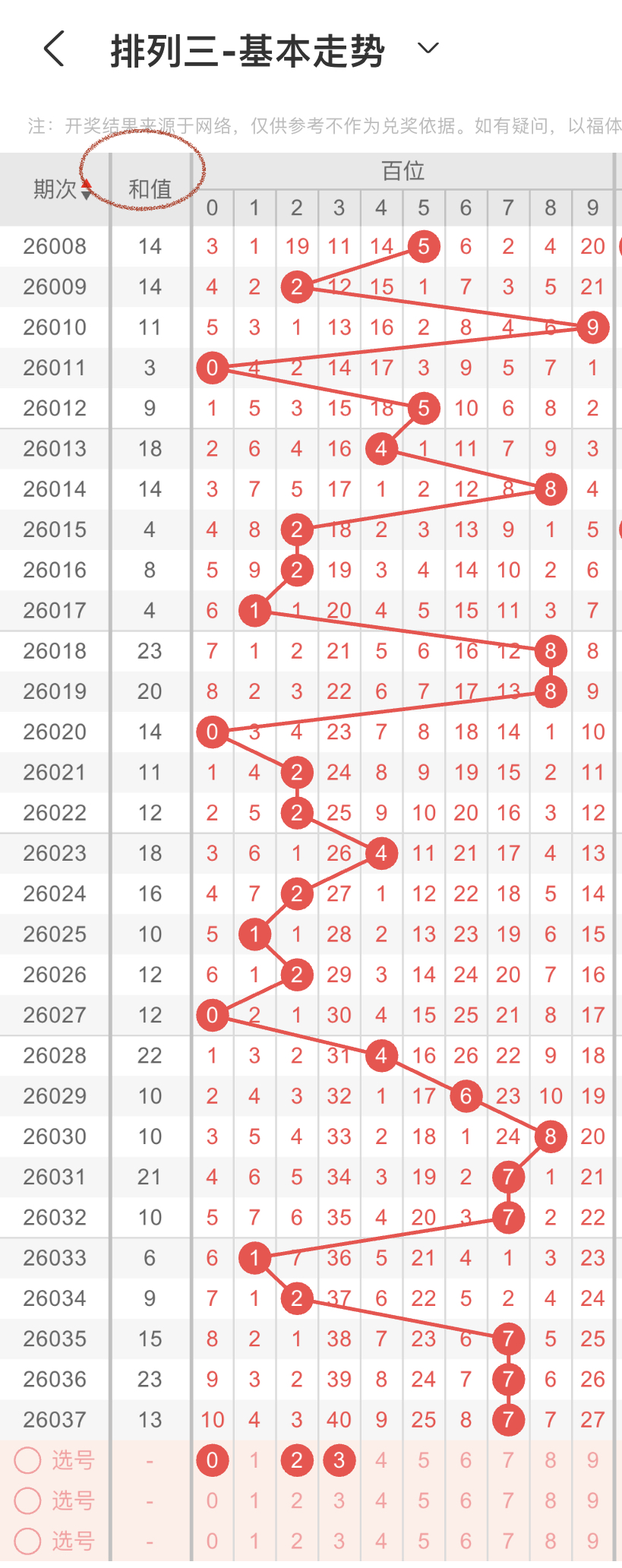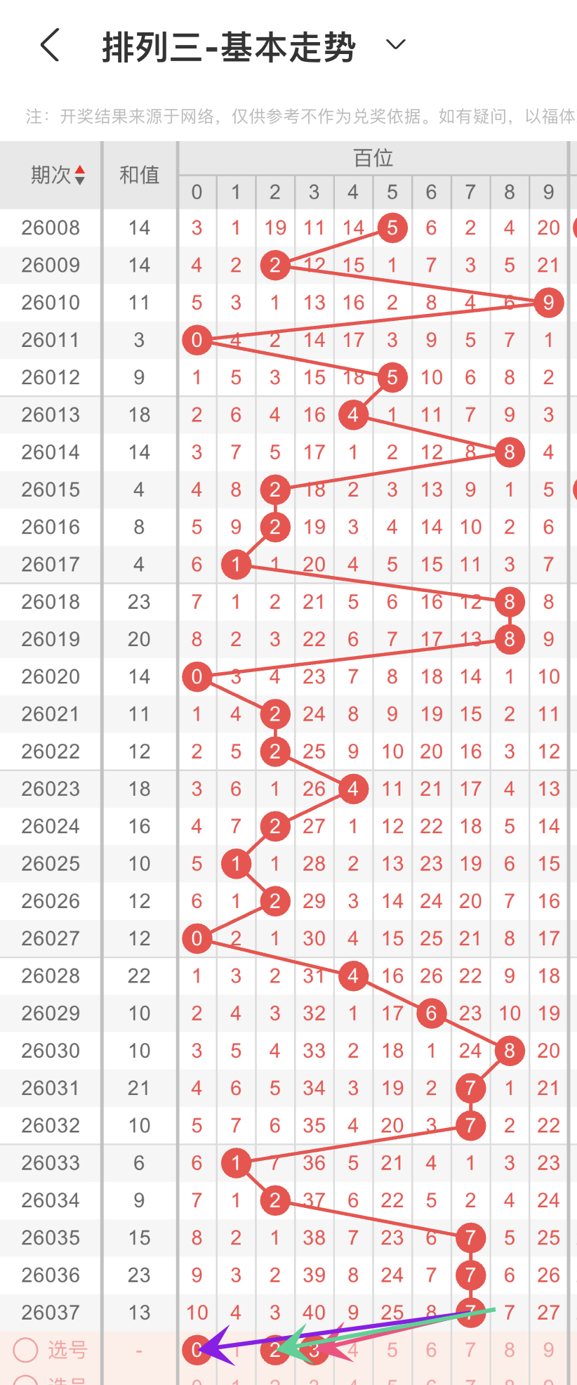 结合上面的大小、奇偶以及012路比,我们可以得到的数据分别是第一组01234,第二组13579,第三组0369,我们重点选择3组数据中重复的,那百位我们选择3,0路的0,2路的2,综上所述百位选023
