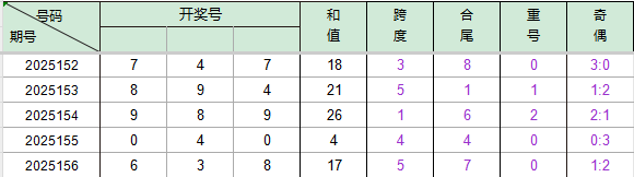 2025152期开奖号码747,我们可以看出近30期百位7出现3次,十位4出现3次(较153期减一),个位7出现4次(较155期减2)。