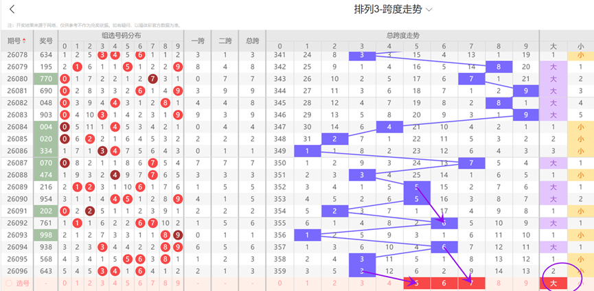 通过观察跨度及跨度属性走势可以发现:近10期内跨度09等号码遗漏值高,出号机会少,本期跨度开出09等号码的可能性小,因此本期跨度选号时可以优先排除09等号码,再结合上述走势图看,本期跨度看好567等号码。