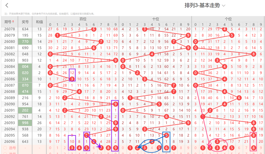 上一期百位开出号码为6,为偶数、大数、合数、0路号码:近10期百位较少开出01等号码,本期百位大概率仍然不会开出01等号码,因此本期百位选号时可以优先排除01等号码,结合上述走势图看,本期百位看好345789等号码。