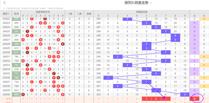 通过观察跨度及跨度属性走势可以发现:近10期内跨度01等号码较少出号,本期跨度大概率仍然不会开出01等号码,因此本期跨度选号时可以优先排除01等号码,再结合上述走势图看,本期跨度看好567等号码。