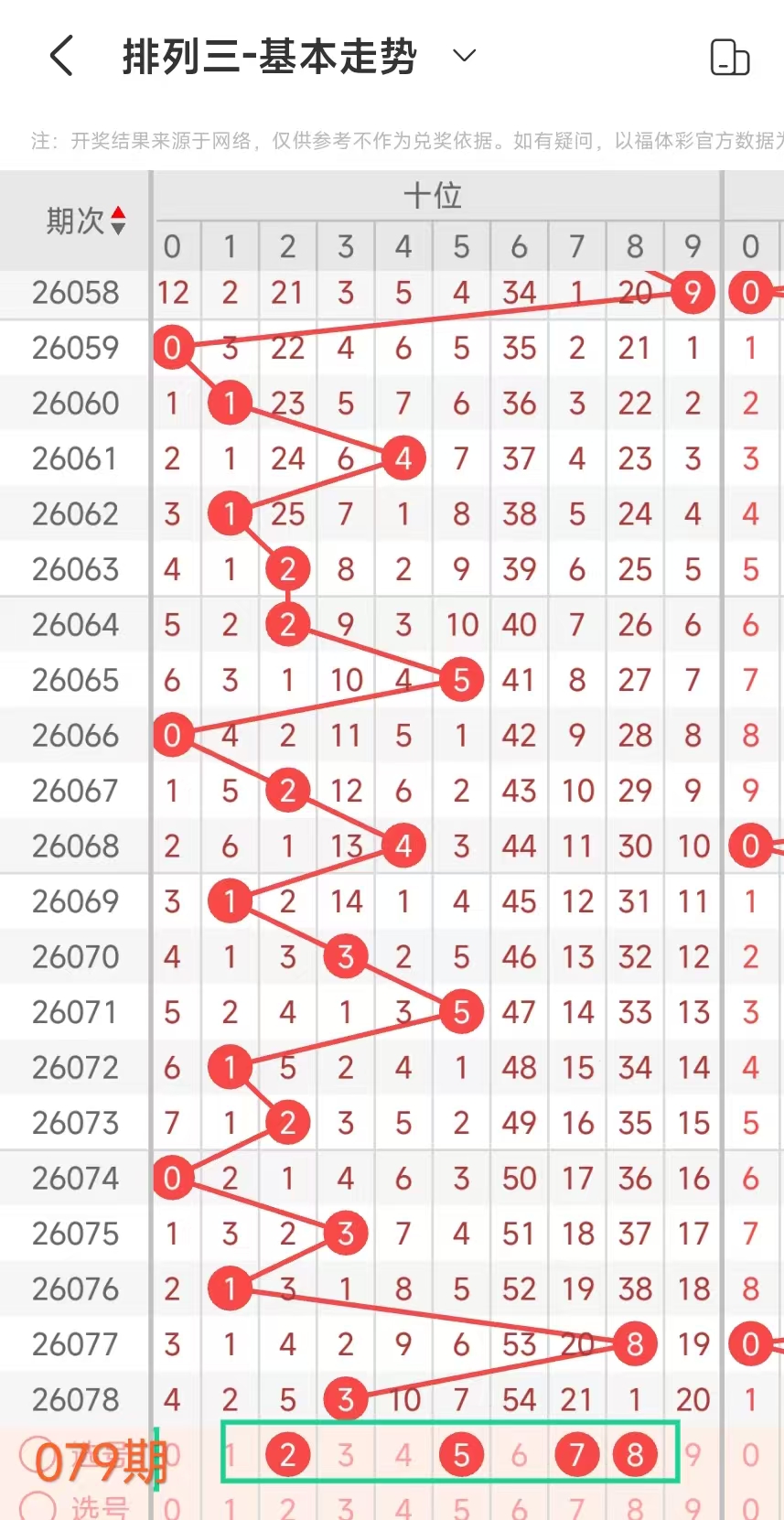 经统计0号出现5次、1号出现6次、2号出现4次、3号出现6次、4号出现6次、5号出9次、6号出现1次、7号出6次、8号出现8次、9号出现8次.统计后出现次数靠前的数字作为我们的备选号码.其号码有1345789等