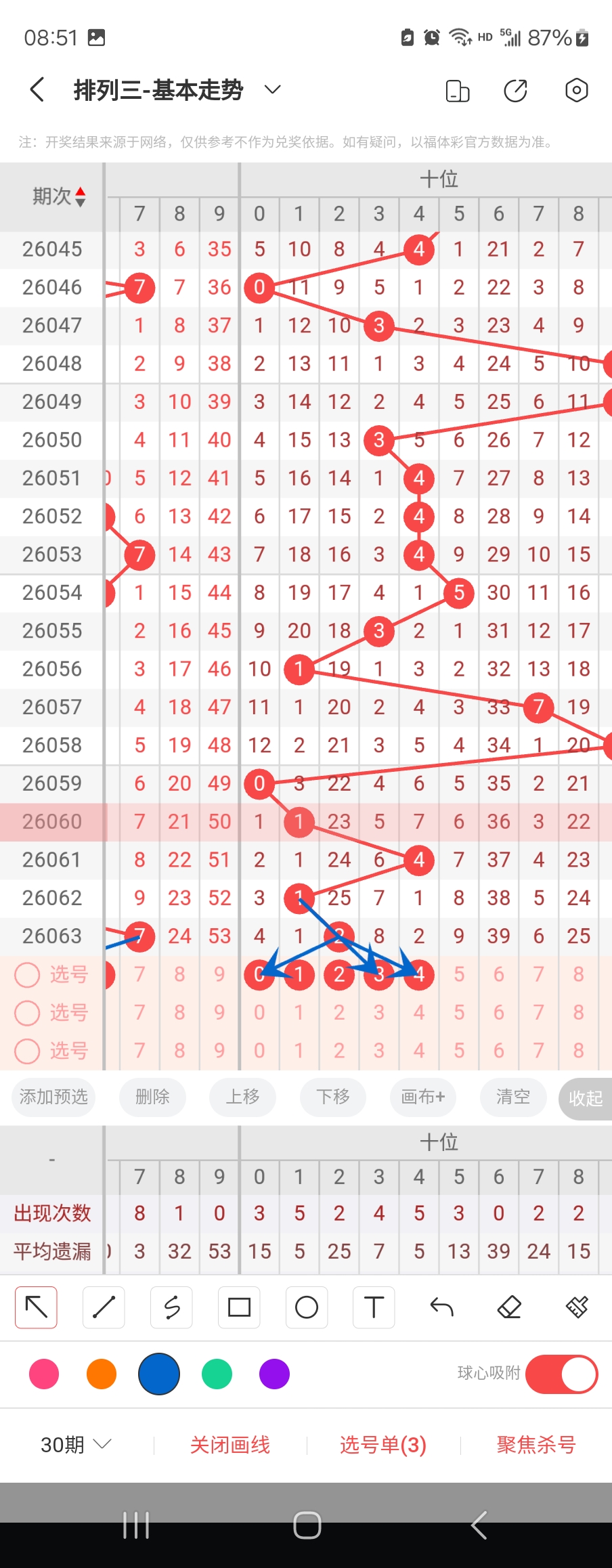 综合上期形态分布利于下期形态选号,约定12357为质,04689为合,147为1路,258为2路,0236为0路,