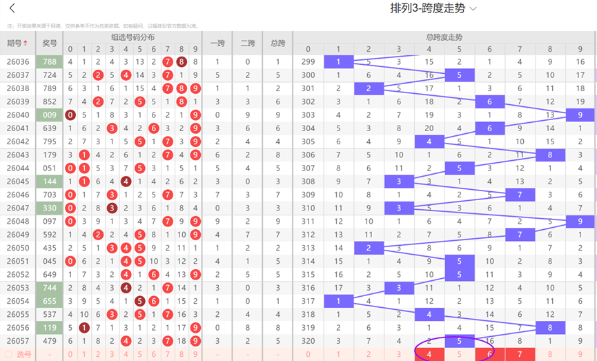 通过观察跨度及跨度属性走势可以发现:近10期内跨度09等号码较少出号,本期跨度开出09等号码的可能性小,因此本期跨度选号时应该考虑09以外的号码,再结合上述走势图看,本期跨度看好467等号码。