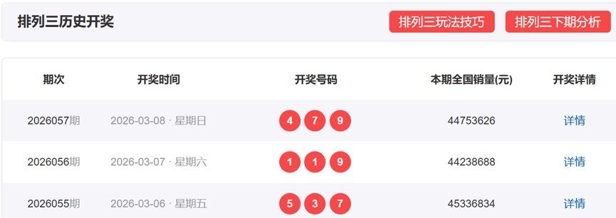 体彩排列3上一期,开奖号码为479,形态为组六,奇偶比为2:1,012路数值表现为110,和值20,和尾0,跨度5。
