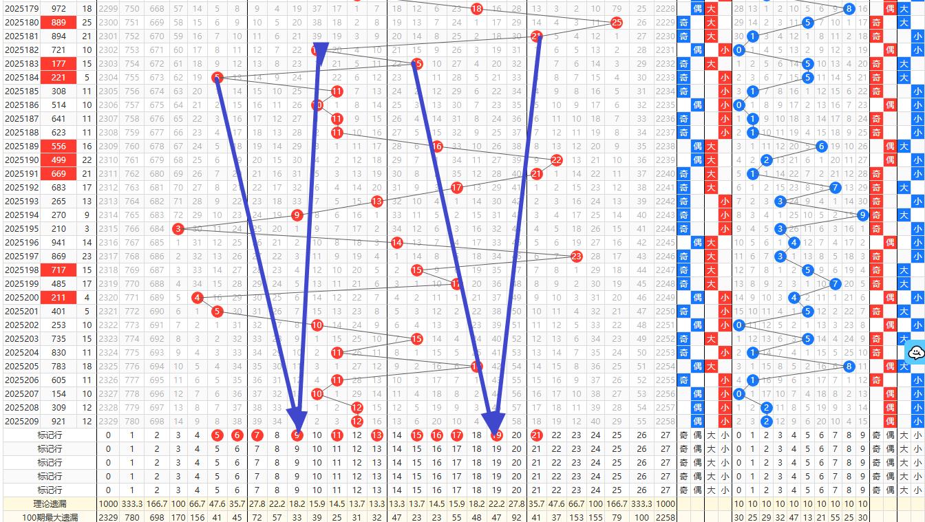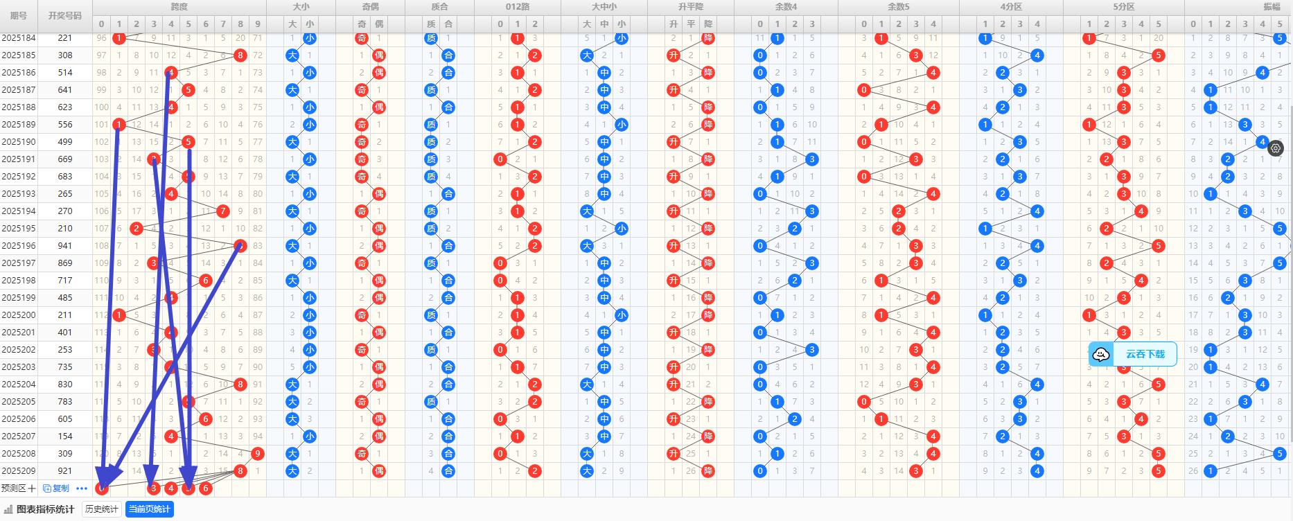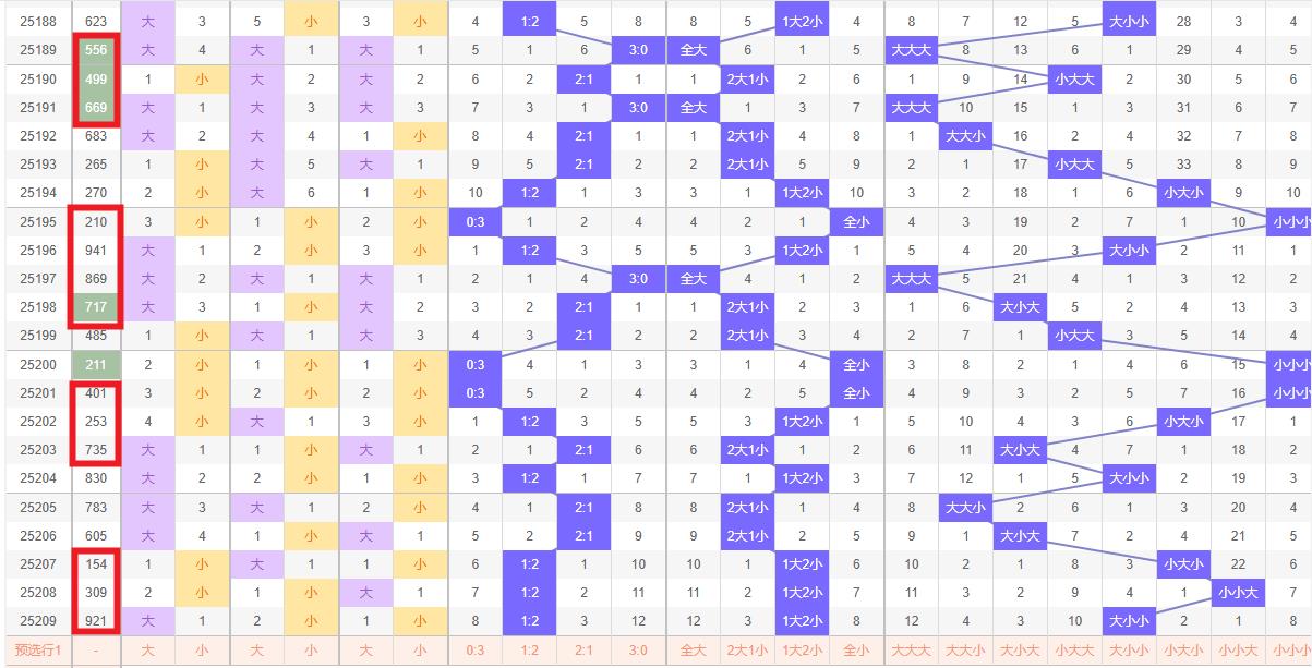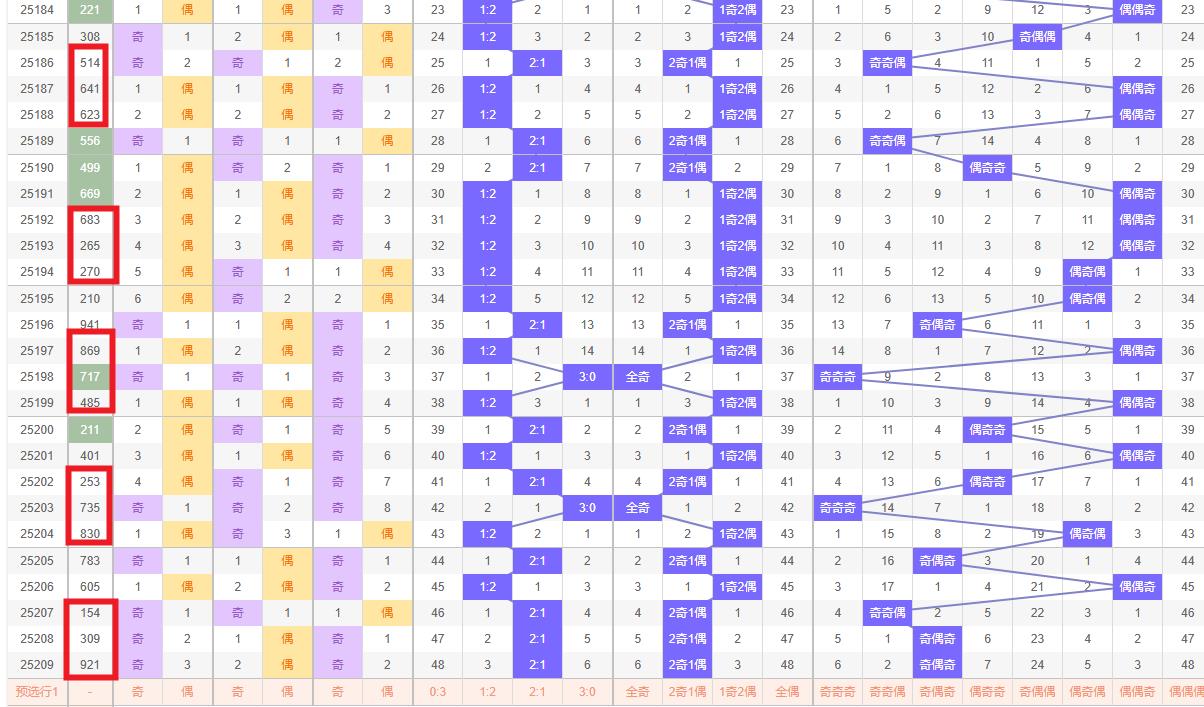 跨度预判 在210期中,开奖号码的跨度为8,属于较小的跨度值。近10期的跨度比为1-4-3-4-8-5-6-4-9-8,且012路的比例为3:4:3,基于这一分析,建议在第210期中重点关注0路和2路的跨度的表现,同时看好奇数跨度的可能性。因此,推荐跨度值为0、3、4、5、6、这些跨度值在近期内具有较高的出现概率。尤其是0.3.5.跨可做为单挑和值的跨度。