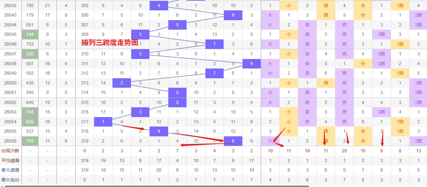 排列三 跨度分析:从上图可以看出近100期的跨度大小比约为53比47,跨度奇偶比约为49比51总体来看还是比较均衡的,但跨度大小之间有点差异。我们再从历史开出8跨后下一期5跨度数据来做参考。最近10期跨度大小比约为4:6期开出小数跨度过多返回大数跨度的概率更高一点。历史开奖近2期出8跨以后的走势为336期开出8跨后下一期走5跨走出3振幅,第351期开出8跨后下一期走3跨走5振幅第017期开出8跨后下一期开出2跨走出6振幅。连续多期大振幅,近期排列三跨度走势来看,5跨作为当前的热号,近期出号频率较高,且走势上呈现出较强的连续性,接下来仍要重点关注其连下的可能;与此同时,2跨作为温号,目前已有明显的升温迹象,各项指标显示其回补动能正在积聚,需防范其由温转热。综合来看,在跨度选择上,以热号5跨为主要关注方向,防守其热度延续,同时对于2跨也要保持足够警惕,适当防范其随时可能走强的趋势,以应对跨度形态的冷热转换节奏。跨度走出2到5个振幅看好的跨度有2356跨,所以第2026057期排列三跨度推荐2356跨。本文由一起彩钱是生命动力所著,请勿转载