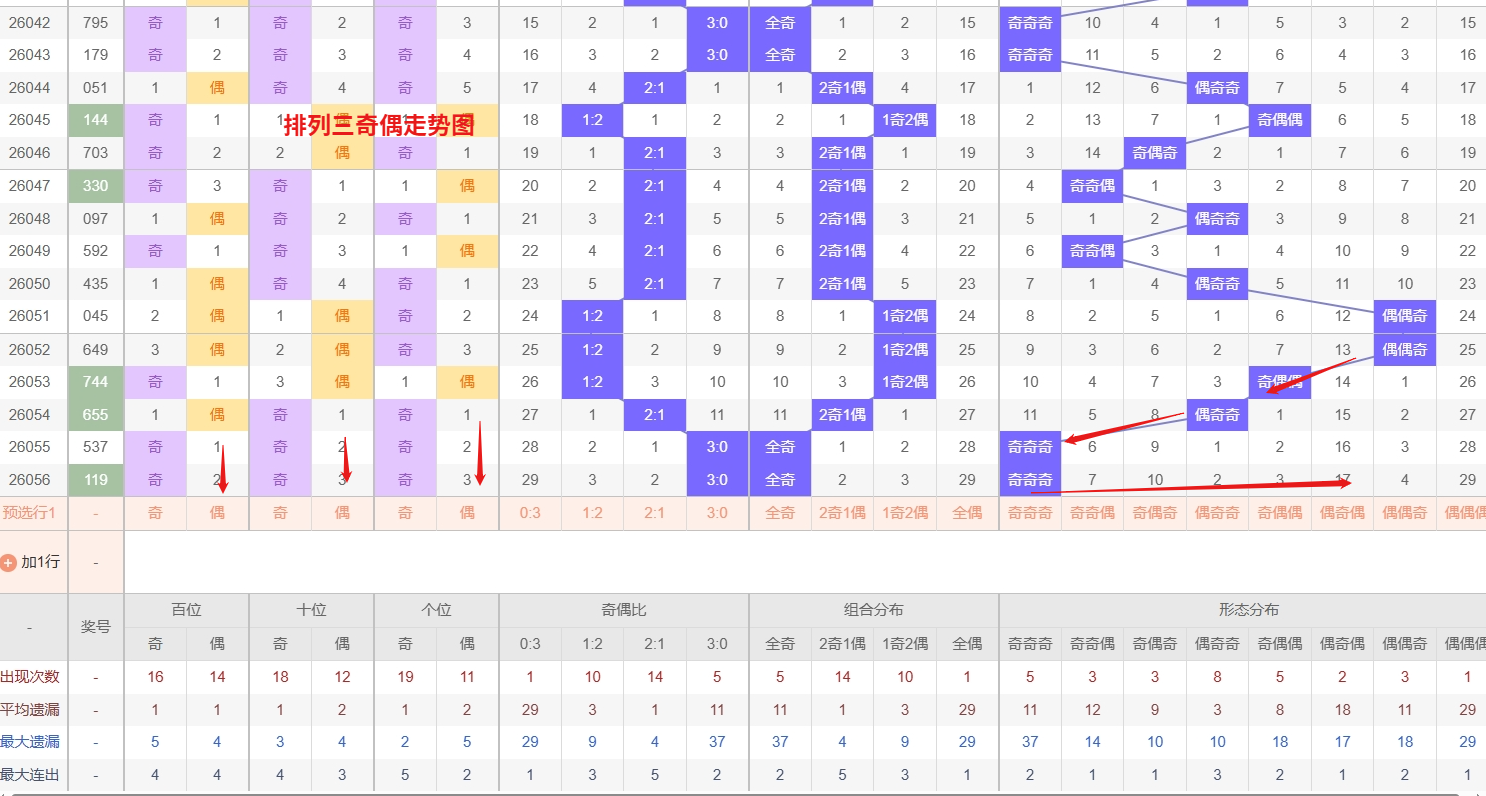 排列三 奇偶分析:从上图可以看出排列三100期内百位奇偶比约为51比49,十位奇偶比为53比47,个位奇偶比为54比46,百位的比值比较均衡,但是个位的比值偏差就有点大,历史奇偶形态近2期开出奇奇奇后下一期的走势为,第333期开出奇奇奇后334期开偶奇奇, 第345期开出奇奇奇后第346期开偶偶偶,第014期开出奇奇奇后第015期开奇偶偶,近期排列三奇偶走势来看,“偶奇奇”形态作为当前的热号组合,近期出号频率较高,且走势上呈现出较强的连续性,接下来仍要重点关注其连下的可能;与此同时,“偶偶偶”形态作为冷号组合,目前已经多期未出,从号码平衡和回补需求的角度分析,近期反弹出现的可能性正在增加,需防范其随时可能现身。综合来看,在奇偶形态的投注思路上,以热号“偶奇奇”为主要关注方向,防守其热度延续,同时对于遗漏期数较长的“偶偶偶”这个冷门组合也要保持高度警惕,适当加大防范力度,以应对冷热转换的节奏,避免顾此失彼。 所以排列三2026057期奇偶形态推偶奇奇与偶偶偶。本文由一起彩钱是生命动力所著,请勿转载