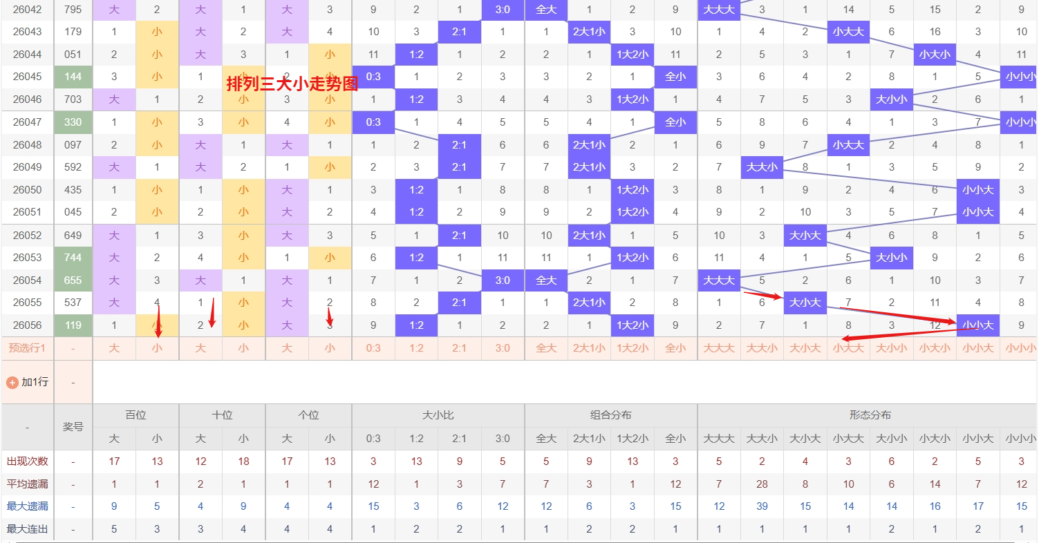 排列三 大小形态分析:从大小走势图上可以看出排列三100期内百位大小比约为52比48,十位大小比约为47:53,个位大小比约为55比45,除了个位和百位奇数比偶数多,十位偶数比奇数多。历史数据近2期开出小小大下一期的走势为,第322期开小小大后第323期开大大小。第345期开出小小大后第336期开小大小,第004期开出小小大后005期开小小小。近期排列三大小走势来看,“大大小”和“小大小”这两种形态作为当前的冷号组合,目前遗漏期数均已较长,从号码平衡理论和回补需求的角度分析,近期反弹出现的可能性正在逐渐增加,需重点防范它们随时可能现身。综合来看,关注重点向这两个冷门组合倾斜,考虑到它们长期未出所积累的反弹动能,适当加大防范力度,以应对冷态回补的节奏,为可能出现的形态转换做好充分准备。所以排列三第2026057期大小形态推荐大大小防小大小。本文由一起彩钱是生命动力所著,请勿转载