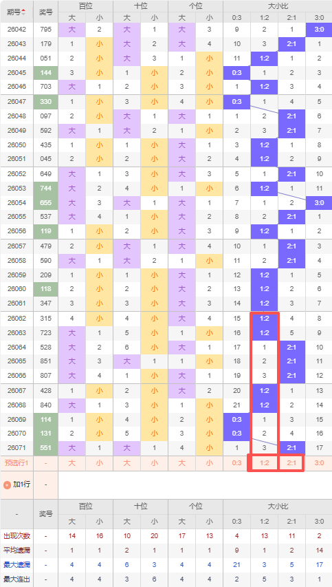 上期大小比:2:1,近10期大小比出现情况:1:2、1:2、2:1、2:1、2:1、1:2、1:2、0:3、0:3、2:1,最近10期出4期2:1,出现4期1:2,出现2期0:3,出现0期3:0,根据近10期出号规律本期推荐连出的2:1,防遗漏3期出1:2,综上所述大小比推荐:防:1:2,重点关注:2:1。