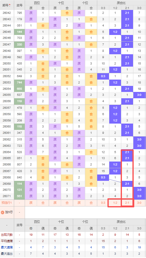 上期质合比:3:0,近10期质合比出现情况:3:0、3:0、2:1、2:1、1:2、1:2、0:3、2:1、3:0、3:0,最近10期出现3期2:1,出现2期1:2,出现1期0:3,出现4期3:0,根据近10期规律本期推荐遗漏4期的1:2,防遗漏2期出2:1,综上所述质合比推荐:防:2:1,重点关注:1:2。