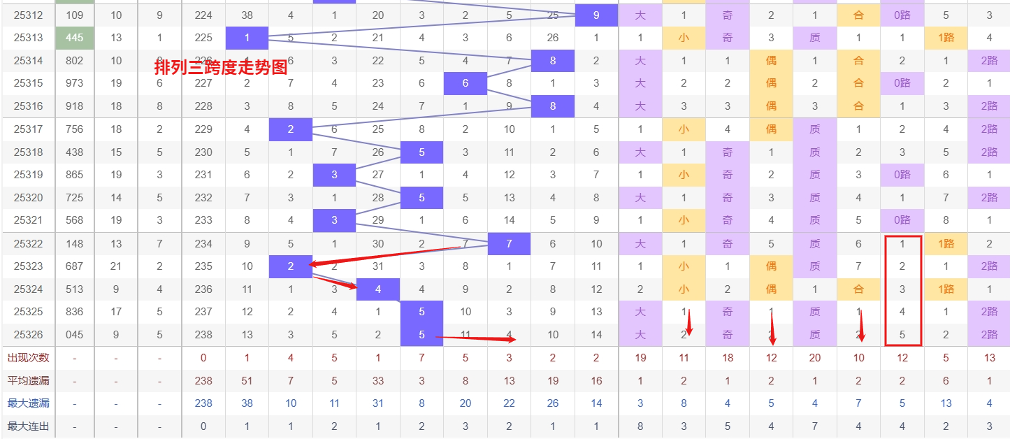 排列三 跨度分析:从上图可以看出近100期的跨度大小比约为51比49,跨度奇偶比约为45比55总体来看还是比较均衡的,但跨度大小之间有点差异。我们再从历史开出5跨后下一期7跨度数据来做参考。最近10期跨度大小比约为5:5期开出小数跨度过多返回大数跨度的概率更高一点。历史开奖近2期出5跨以后的走势为251期开出5跨后下一期走4跨走出1振幅,第263期开出5跨后下一期走8跨走出3振幅第287期开出5跨后下一期开出3跨走出2个振幅。连续多期小振幅,近期排列三跨度走势观察,3跨已进入明确的热态周期,频繁开出显示出强劲的活跃度,短期内仍有延续热度甚至连续出现的较高可能,应作为当前追踪的重点对象。与此同时,4跨则处于明显的冷态区间,遗漏值持续累积。根据跨度走势的平衡规律,任何冷跨在经历长期沉寂后,其回补需求都会逐步增强;关注热跨3延续态势的同时,对冷跨4的潜在反弹保持警惕,本期预计跨度遵从历史会走出小振幅,出5跨度后容易走出2到4个跨度振幅的对称形态,跨度走出2到4个振幅看好的跨度有4378跨,所以第2025327期排列三跨度推荐4378跨。本文由一起彩钱是生命动力所著,请勿转载