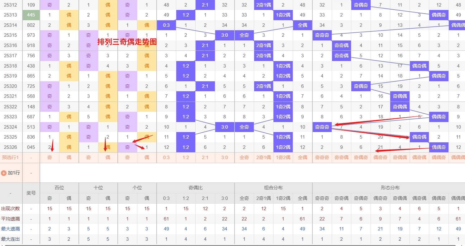排列三 奇偶分析:从上图可以看出排列三100期内百位奇偶比约为47比53,十位奇偶比为45比55,个位奇偶比为54比46,百位的比值比较均衡,但是个位的比值偏差就有点大,历史奇偶形态近2期开出偶偶奇后下一期的走势为,第252期开出偶偶奇后253期开奇偶偶, 第273期开出偶偶奇后第264期开偶奇奇,第297期开出偶偶奇后第298期开偶偶偶,近期排列三奇偶组合走势来看,“奇偶偶”组合已形成明确的热态,短期内仍有延续出现的可能,与此同时,“偶偶偶”组合则陷入明显的冷态,长期遗漏使其回补压力不断累积。根据奇偶分布的历史规律,全形态的冷态组合一旦回补,容易打断当前的热态趋势。因此,在重点关注“奇偶偶”热态延续的同时,对“偶偶偶”保持警惕,所以排列三2025327期奇偶形态推奇偶偶与偶偶偶。本文由一起彩钱是生命动力所著,请勿转载