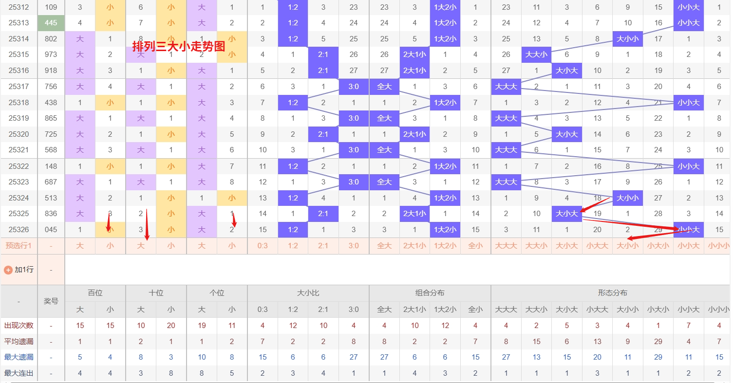 排列三 大小形态分析:从大小走势图上可以看出排列三100期内百位大小比约为46比54,十位大小比约为49:51,个位大小比约为55比45,除了个位奇数比偶数多,十位和百位是偶数比奇数多。历史数据近2期开出小小大下一期的走势为,第242期开出小小大第243期开小小小。第264期开出小小大后第265期开小大小,第282期开出小小大后283期开小大大。近期排列三大小组合走势来看,“小小小”组合已进入明确的热态周期,连续开出显示其形态正受到追捧,短期内仍有一定延续可能,可作为当前关注的重点。与此同时,“小大小”组合则处于明显的冷态区间,其遗漏值已累积至较高水平。根据大小组合的分布规律,任何冷态形态在经历长期沉寂后,其技术性回补的需求都会显著增强,容易打断既有热态趋势的连续性。所以排列三第2025327期大小形态推荐小大小防小小小。本文由一起彩钱是生命动力所著,请勿转载