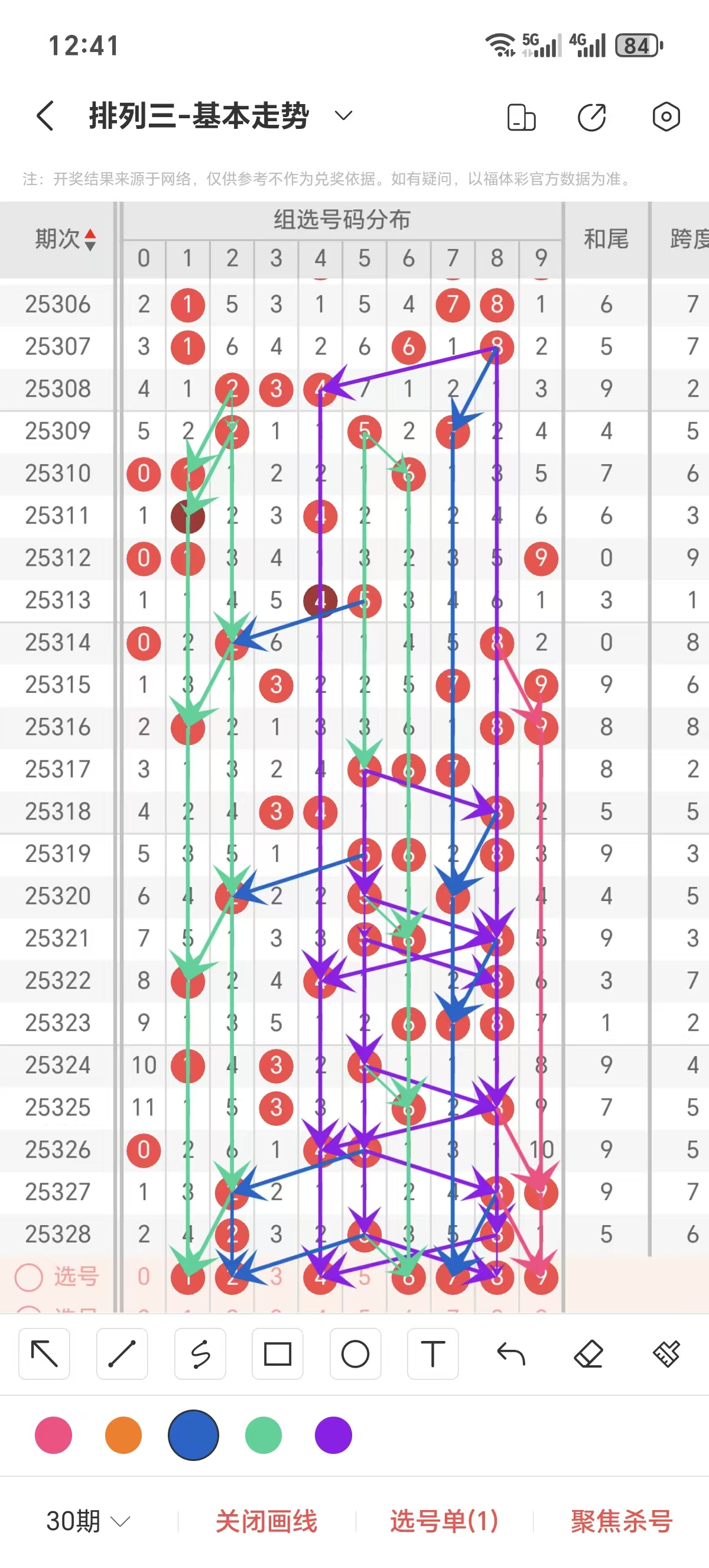 通常情况下在五期之内重复一个跨度的概率较高,近五期重复了5的跨度,近五期跨度为4/5/5/7/6,近期12路的跨度较热,本期要侧重3/5跨为主的号码组合。选择好跨度就可以从跨度方面选择相应的双胆码组合,双胆码的选取要根据近期和历史的走势进一步的分析选取。