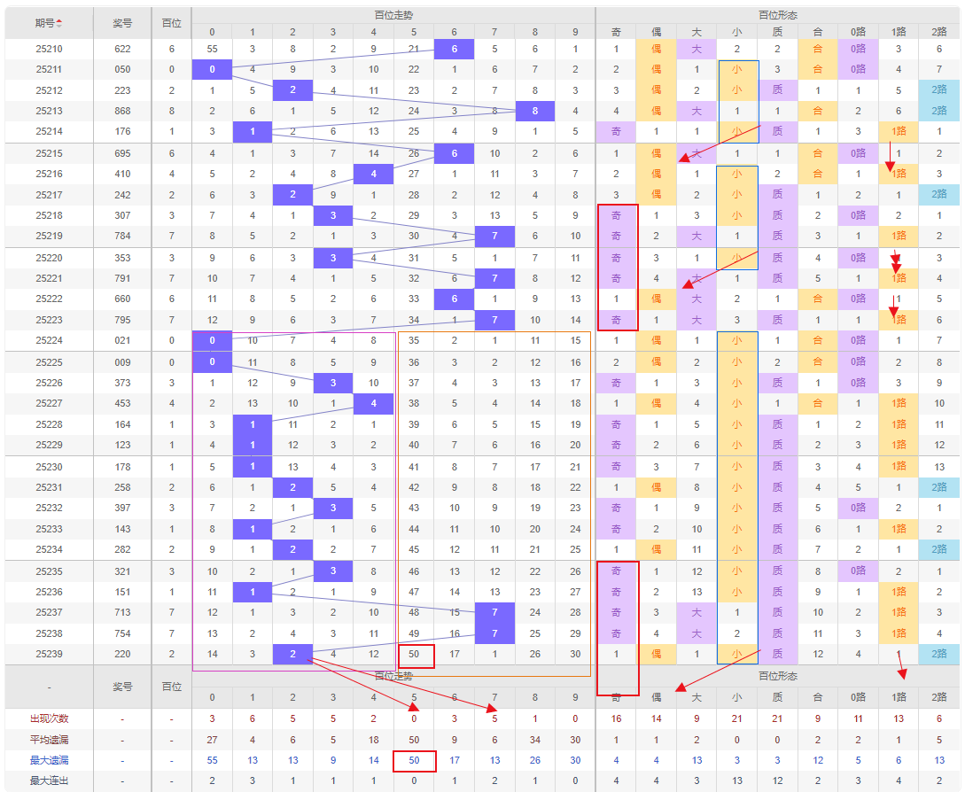 当前百位5号已遗漏50期作为目前遗漏期数最久的冷号,后续建议开始持续重点关注。
