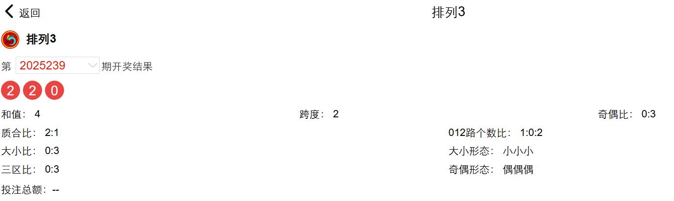 排列3上期开出两个奇数号2   2   0,跨度:2,和值:4,奇偶比:0:3,质合比:2:1,大小形态:小小小,三区比:0:3, 012路个数比:1:0:2
