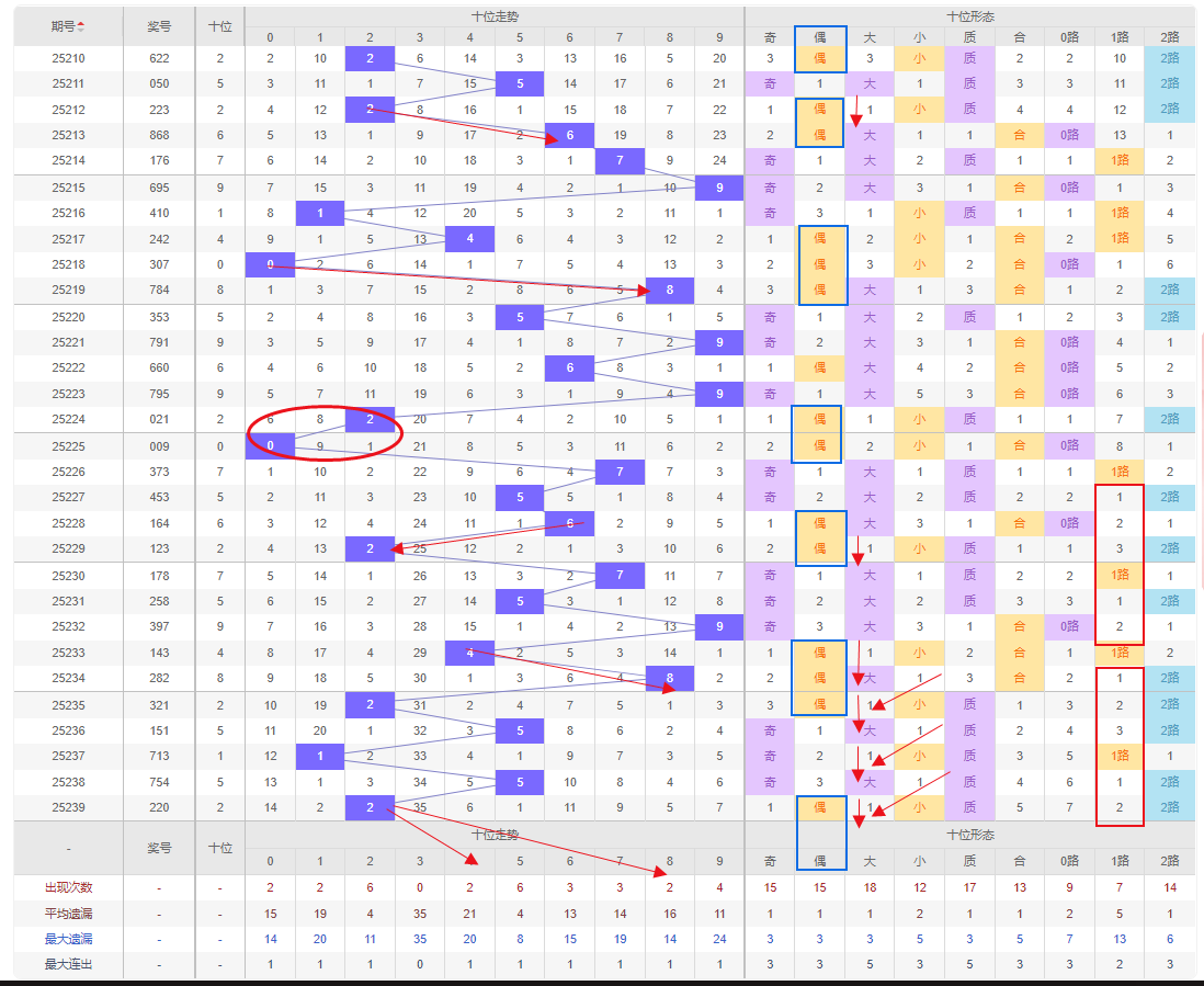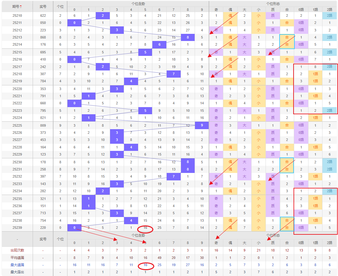 个位的大小号方面近30期开出了21期小号9期大号,开出小号的概率是开出大号概率的两倍多,那么本期可主要关注小号防大号。建议个位本期在结合一下质数合数分析,如图所示近30期内合数几乎都是只单期开出,总共开出了合数连出都没超过连续2期的,而当前已经连续两期开出合数了,那么本期建议继续按照图中红色箭头所示形态开出质数。