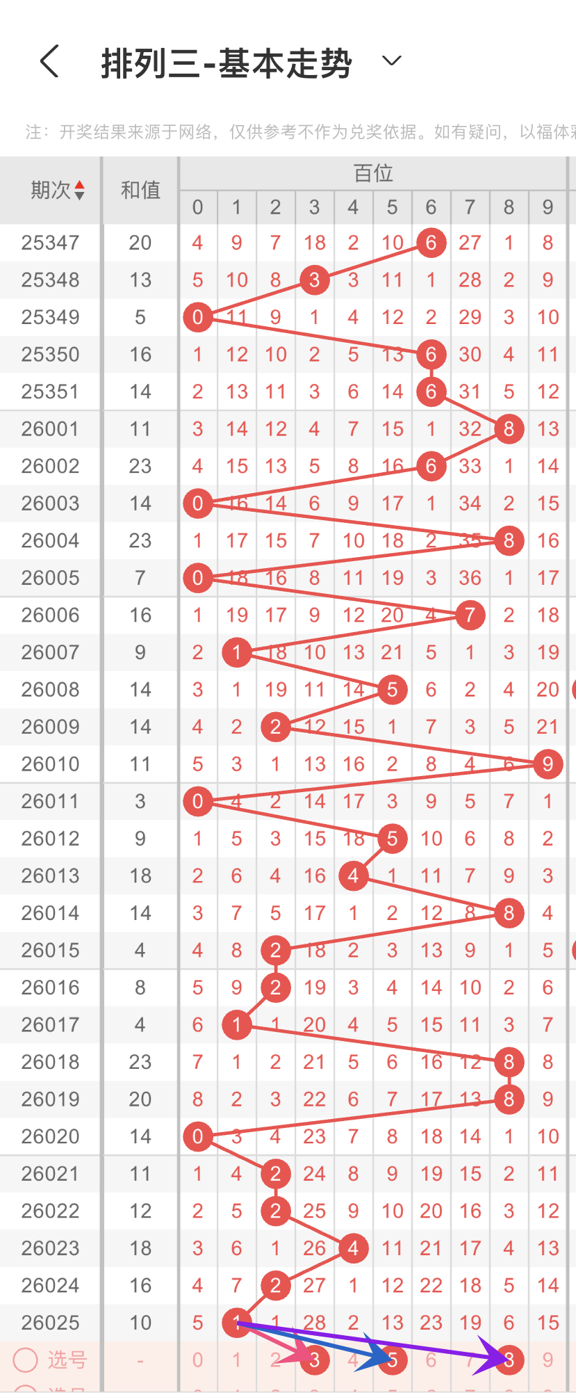 结合上面的大小、奇偶以及012路比,我们可以得到的数据分别是第一组01234,第二组13579,第三组0369,我们重点选择3组数据中重复的,那百位我们选择3,2路的58,综上所述百位选358