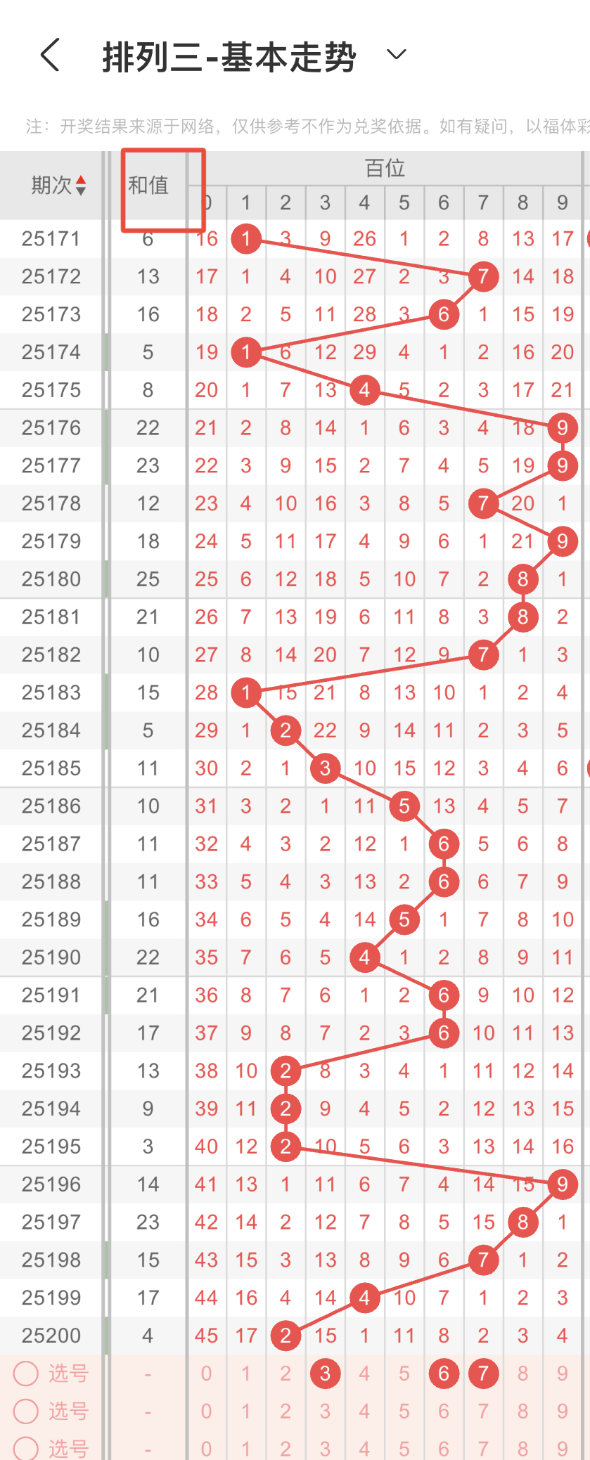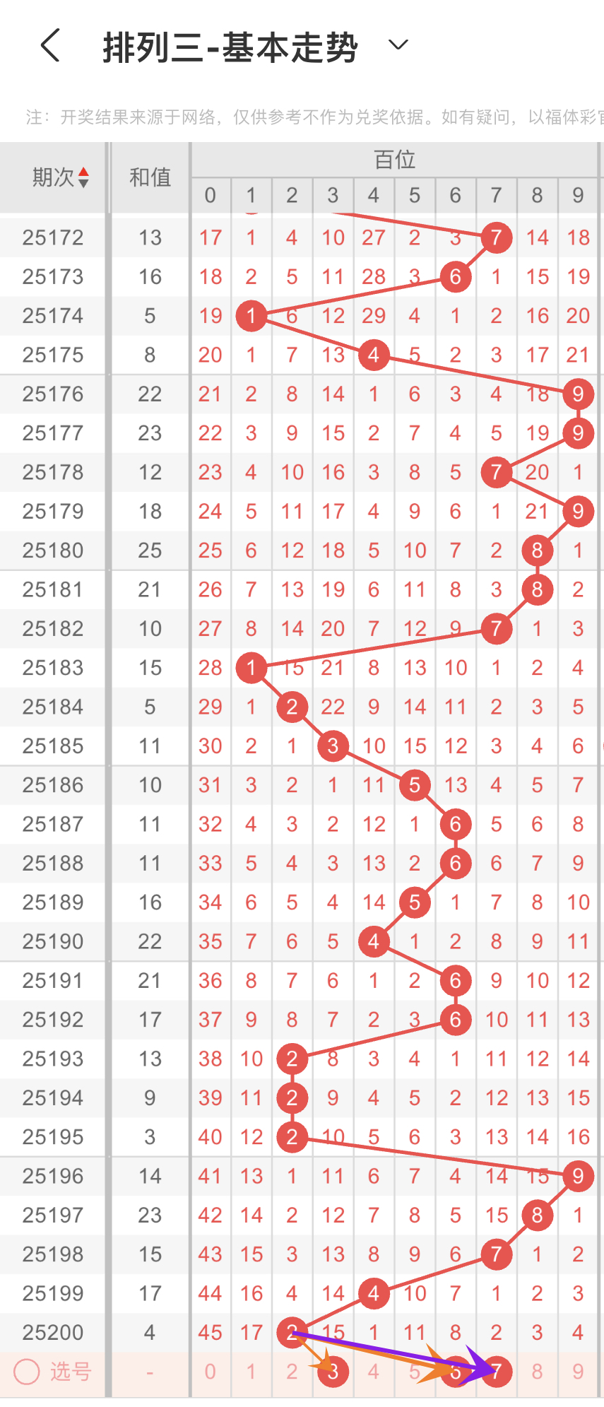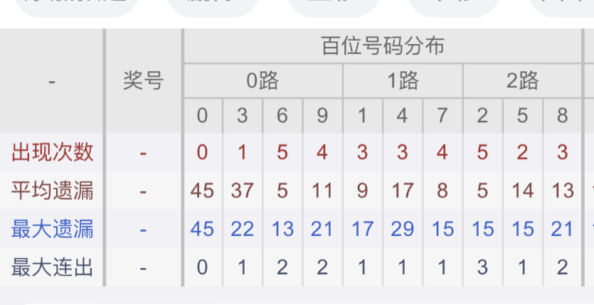 结合上面的大小、奇偶以及012路比,我们可以得到的数据分别是第一组56789,第二组13579,第3组147,我们重点选择3组数据中重复的,那百位我们选择7,防2路0路的36,综上所述百位选367