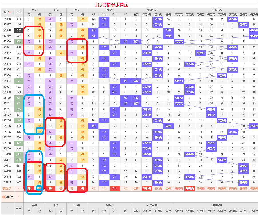 上一期的奇偶比为1:2,两偶的号码组合,从近五期的奇偶数出现情况看,奇数出现6次,偶数出现9次,奇数号码出现较少,本期要侧重两奇的号码组合,侧重奇奇偶防全奇全偶的号码组合,根据奇偶组合形态可做五码定位13579/13579/02468