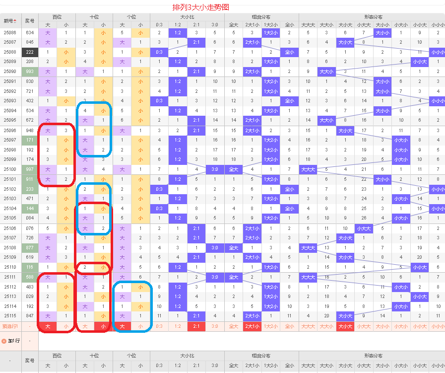 上一期大小比为2:1,两大的号码组合,近五期大号出8次,小号出现7次,大小号码出现较平均,上一期是两大的号码组合,本期侧重两大的号码组合,百位本期侧重大号码,十位本期侧重小号码,个位侧重大号码,侧重大小大的号码组合,根据大小形态五码定位56789/01234/56789