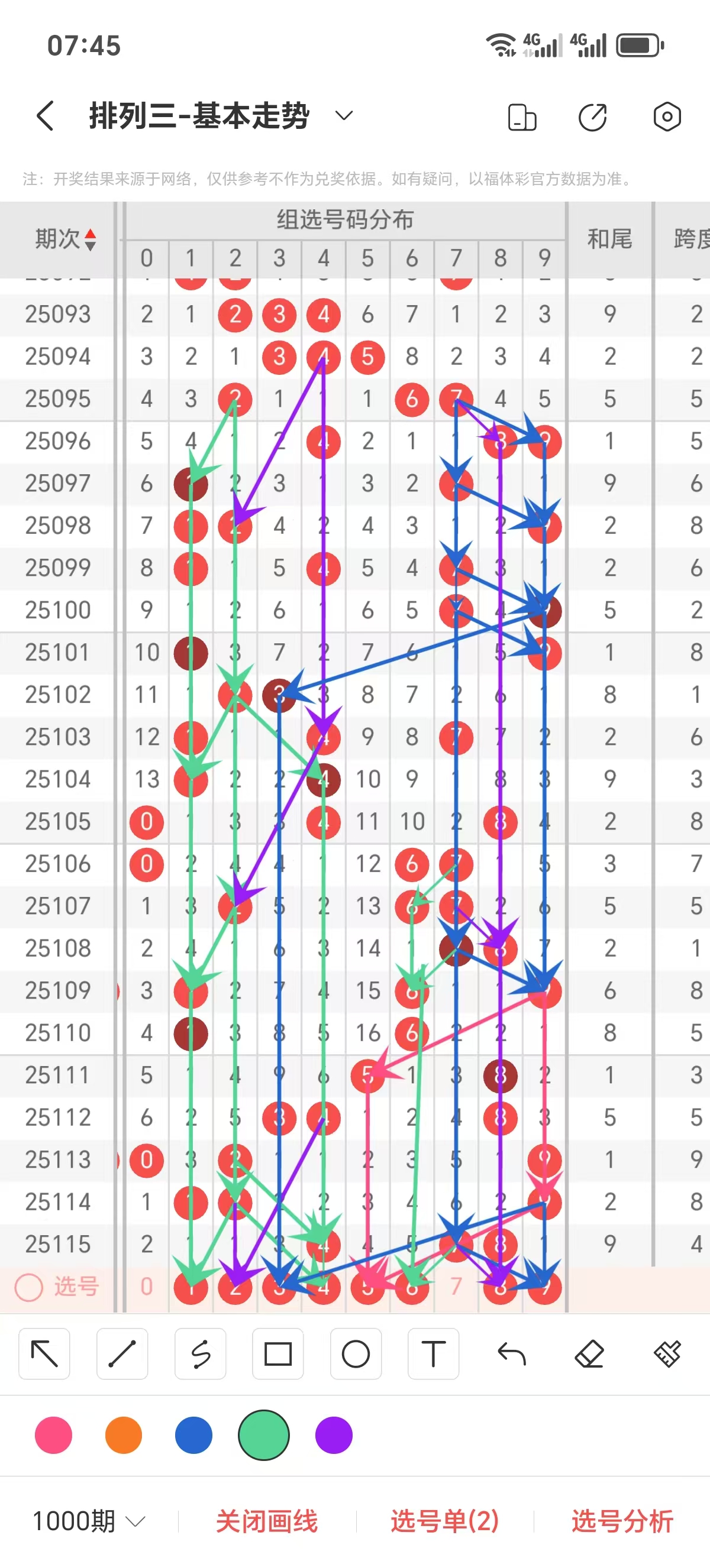 跨度通常情况下在五期之内重复一个跨度的概率较高,近五期没有重复的跨度,近五期跨度为3/5/9/8/4,近期0路和2路的跨度较热,本期要侧重6/7跨为主的号码组合。选择好跨度就可以从跨度方面选择相应的双胆码组合,双胆码的选取要根据近期和历史的走势进一步的分析选取。