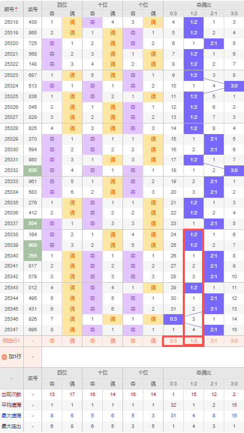 上期奇偶比:2:1,近10期奇偶比出现情况:1:2、1:2、2:1、2:1、2:1、1:2、2:1、2:1、0:3、2:1,最近10期出现6期2:1,出现3期1:2,出现1期0:3,出现0期3:0,根据近10期出号规律本期推荐隔期出0:32,防遗漏4期出1:2,综上所述奇偶比推荐:防:1:2,重点关注:0:3。
