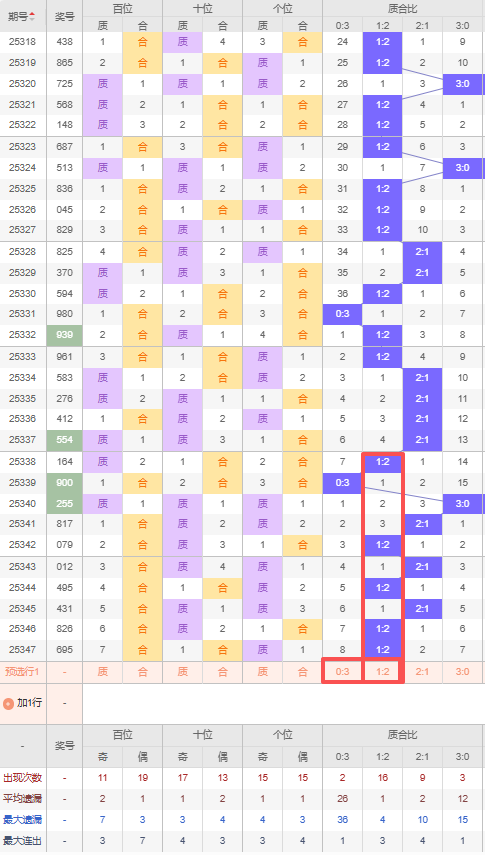 上期质合比:1:2,近10期质合比出现情况:1:2、0:3、3:0、2:1、1:2、2:1、1:2、2:1、1:2、1:2,最近10期出现3期2:1,出现5期1:2,出现1期0:3,出现1期3:0,根据近10期规律本期推荐三连出1:2,防遗漏8期出0:3,综上所述质合比推荐:防:0:3,重点关注:1:2。