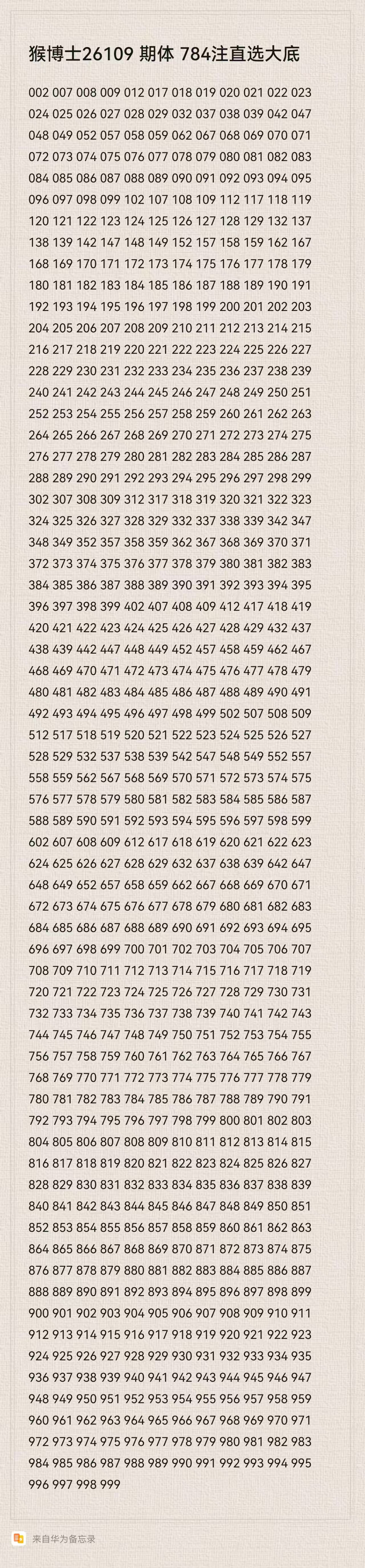 猴博士26109期排列三784注直选大底:(可以当母底用,然后进行缩水)