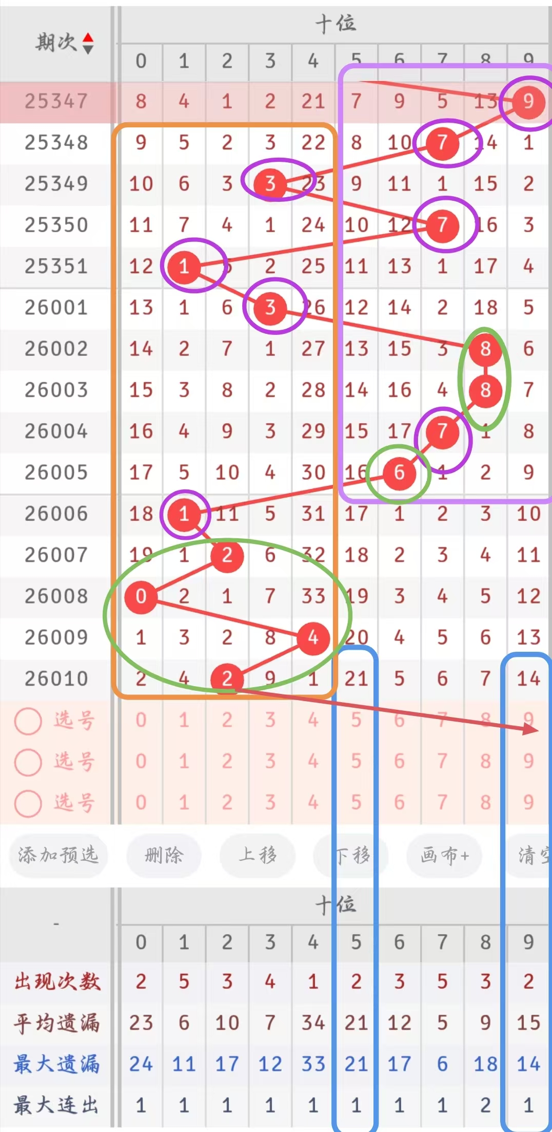 体彩排列3第2026011期个位首先分析奇偶数号,如图所示近15期开出了7期奇数8期偶数,出现奇数的概率与开出偶数的概率几乎相同且开出偶数号时最多连出两期,上两期已经连续开出偶数号那么本期开出奇数号的概率较大建议关注奇数号。杀号建议定在所有偶数号,但偶数4号都已经遗漏了23期达到了最大遗漏期数建议开出防冷号开出。
