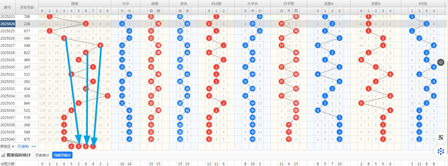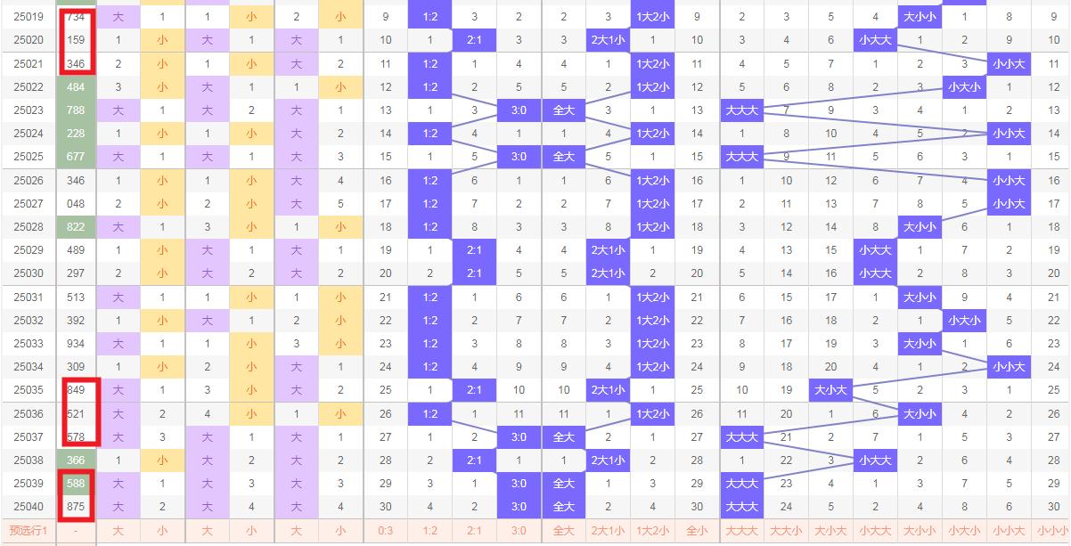 综合以上分析,可以得出以下几点建议: • 大小走势:关注两小一大或一小两大的组合,如012、023、124等。 • 奇偶比例:重点考虑两偶一奇的形态,例如024、046、248等。 • 跨度预判:选择大跨度号码,如跨度为3、4、5、8、9的组合,例如147、258、369等。 • 和值预判:关注和值较小的号码组合,如和值为6的015、024,和值为7的016、025等。