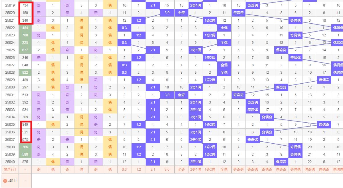 奇偶比例分析: • 奇偶比例方面,排列3的号码走势也显示出一定的规律。在历史同期开奖中,两奇一偶组合出现9期,两偶一奇组合出现7期,全奇组合和全偶组合出现次数较少。从奇偶总比例来看,奇偶号码走势相当,例如在某期开奖中,奇偶总比例为25:29。结合当前走势,预计偶数号码将热出,建议关注奇偶比为1:2的组合,即两偶一奇形态。
