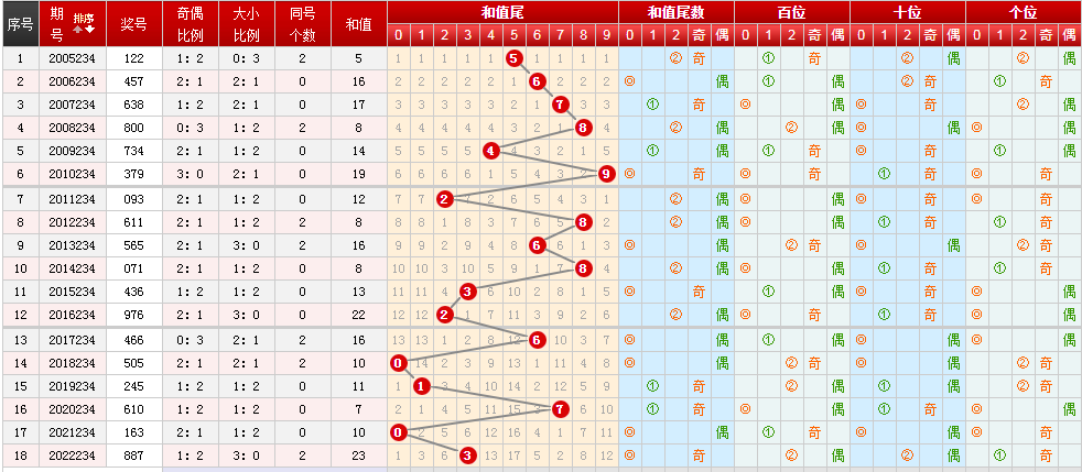 奇偶分析:近三十期奇数和值共开出十二期,偶数和值共开出十八期,和值偶数比较占优。近五期分别开出3奇2奇2奇2奇0奇,奇数占优。观察各位置奇偶分布情况,本期和值偶难定。