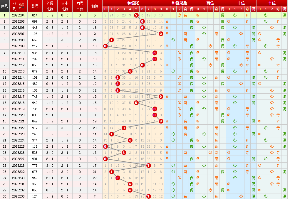 再来看看排列3最近三十期开奖号码及基本参数特征图(如下图)