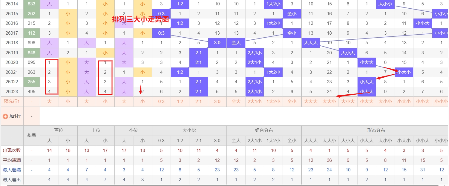 排列三 大小形态分析:从大小走势图上可以看出排列三100期内百位大小比约为51比49,十位大小比约为48:52,个位大小比约为54比46,除了个位和百位奇数比偶数多,十位偶数比奇数多。历史数据近2期开出小大大下一期的走势为,第302期开出小大大第303期开大小大。第315期开出小大大后第316期开大小小,第327期开出小大大后328期开大大小。排列三近期大小走势观察,“大大小”组合表现活跃,形成短期热态,其延续性值得重点关注,需防范其继续热出的可能。与此同时,“大小大”组合已沉寂多期,呈现明显冷态。根据概率均衡与冷热转换的规律,冷态组合随着遗漏值的增长,其回补的预期与压力也在同步累积,存在较强的反弹可能。综合来看,当前阶段宜采取热态跟进,冷态设防的策略:一方面紧盯“大大小”的热出惯性,另一方面也需为“大小大”的可能回补做好准备,所以排列三第2026024期大小形态推荐大小大大大小本文由一起彩钱是生命动力所著,请勿转载