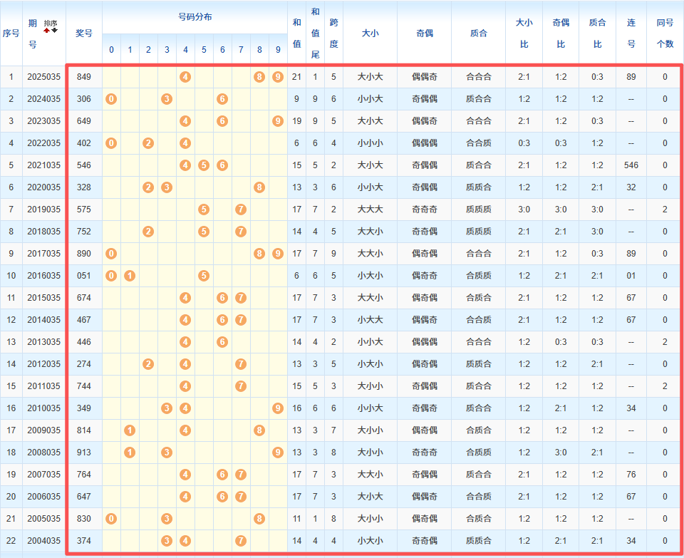 1、统计往年同期开奖号码