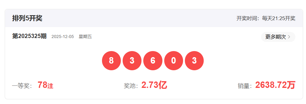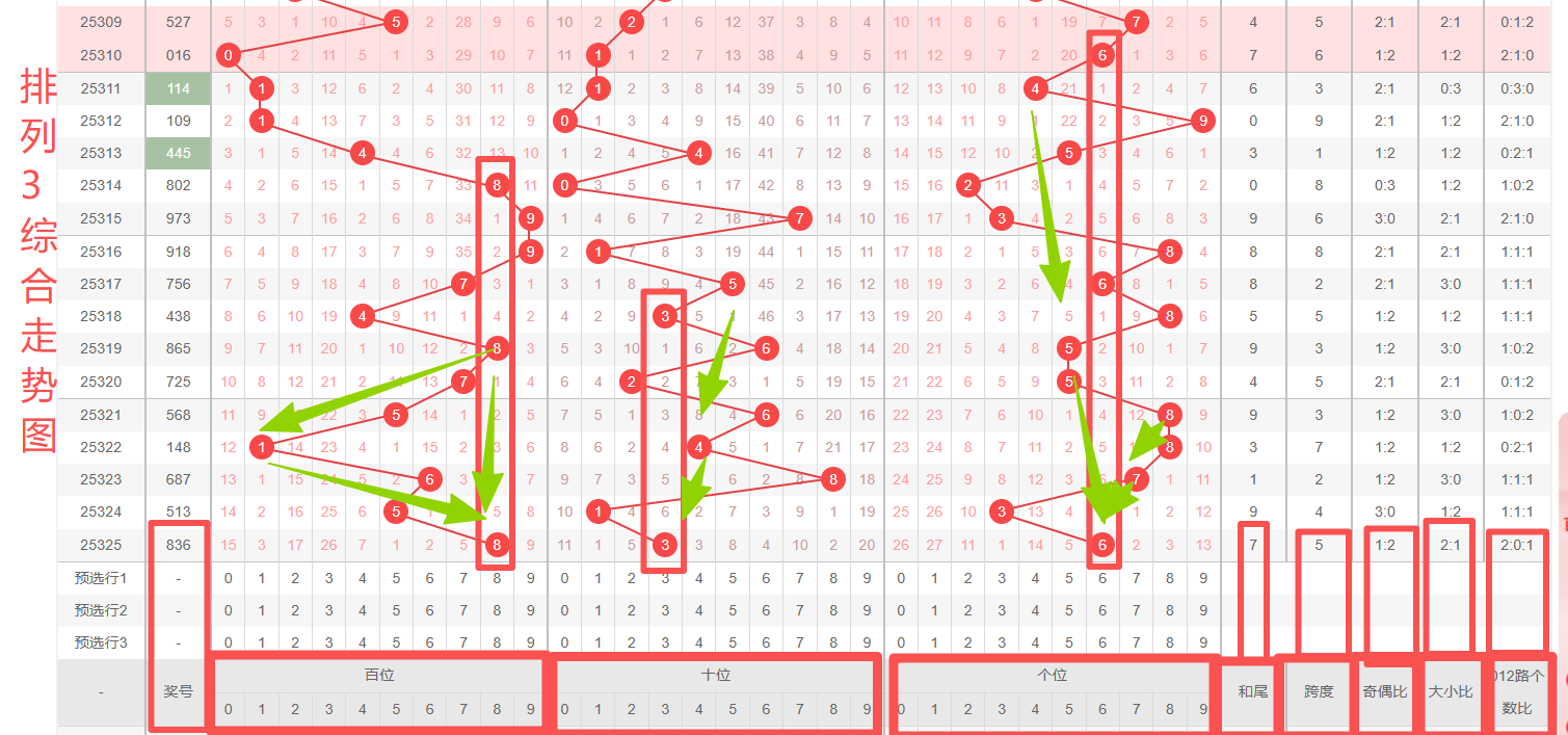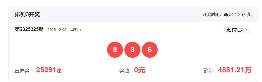 体彩排列3第2025325开奖号码836,形态为组六,奇偶比1:2,和值17,跨度5,大小比2:1,【012】路个数比2:0:1。