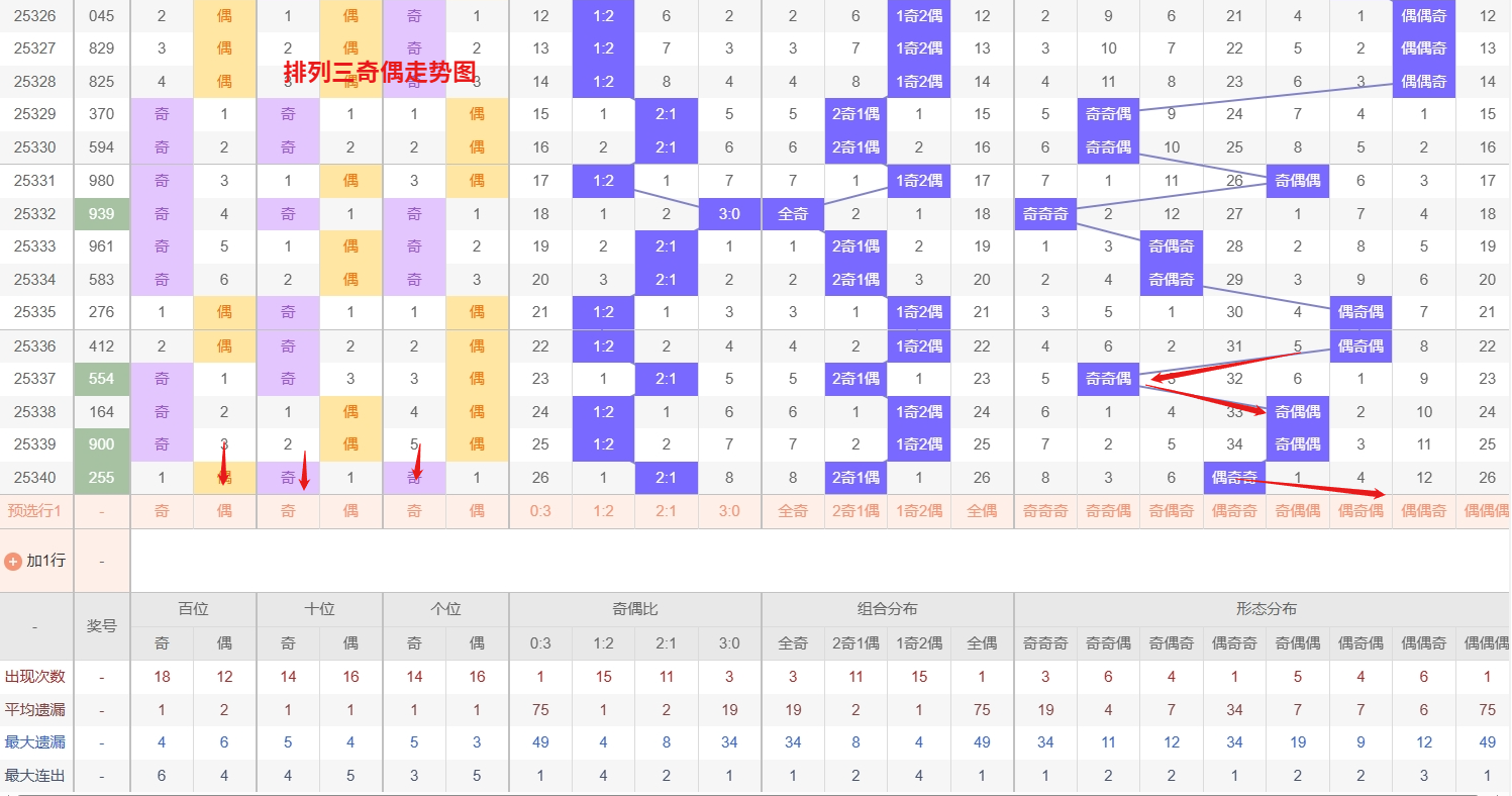 排列三 奇偶分析:从上图可以看出排列三100期内百位奇偶比约为48比52,十位奇偶比为53比47,个位奇偶比为45比55,百位的比值比较均衡,但是个位的比值偏差就有点大,历史奇偶形态近2期开出偶奇奇后下一期的走势为,第254期开出偶奇奇后255期开偶偶偶, 第273期开出偶奇奇后第274期继续开偶奇奇,第295期开出偶奇奇后第296期开偶偶奇,近期排列三奇偶形态走势分析,偶奇奇形态虽然在最新一期开出,但在此之前经历了较长的遗漏周期,这种破冰后的形态往往容易形成短期热度,具备连开可能,值得重点留意。与此同时,偶偶偶形态已持续多期未现,成为典型冷态,其回补压力正在逐渐积累,需防范其突然解冻。而偶偶奇则处于近期热态之中,表现较为活跃,短期内仍有持续开出的潜力。所以排列三2025341期奇偶形态推偶偶偶与偶奇奇。本文由一起彩钱是生命动力所著,请勿转载