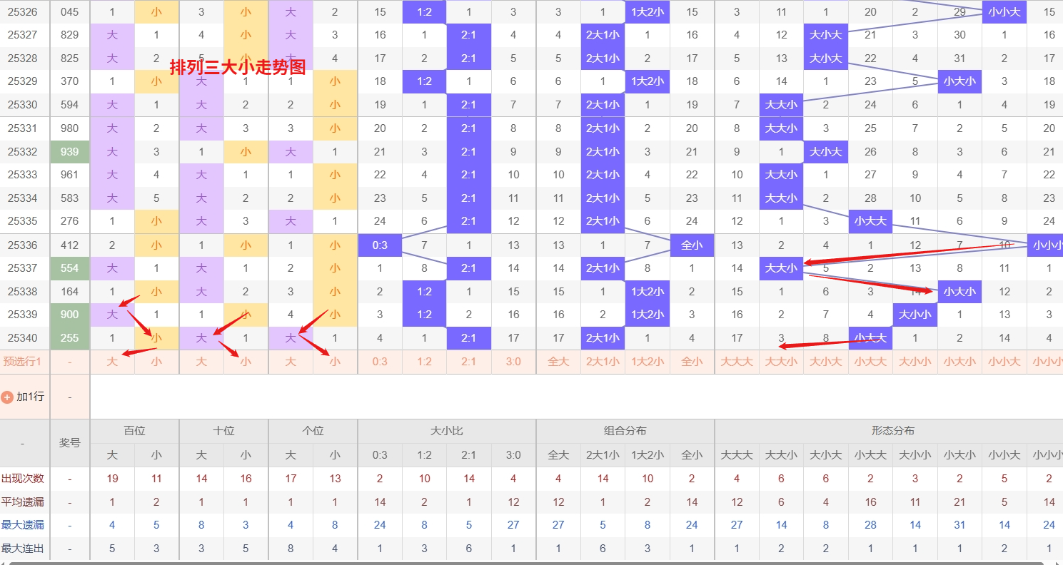 排列三 大小形态分析:从大小走势图上可以看出排列三100期内百位大小比约为54比46,十位大小比约为47:53,个位大小比约为51比49,除了个位和百位奇数比偶数多,十位是偶数比奇数多。历史数据近2期开出小大大下一期的走势为,第265期开出小大大第266期开大大大。第274期开出小大大后第275期开小小大,第293期开出小大大后294期开大小大。近期排列三大小形态走势分析,小小大与大大大两大形态正呈现明显的热态趋势,短期内频繁开出,根据形态走势的周期性规律,因此接下来仍需重点关注这两类形态的持续表现,警惕其可能出现的热度延续。所以排列三第2025341期大小形态推荐大大大防小小大。本文由一起彩钱是生命动力所著,请勿转载