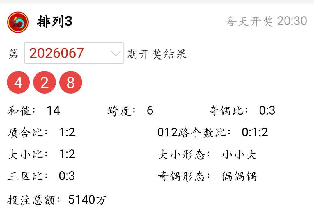 排列3上期(2026067)开奖号码详情