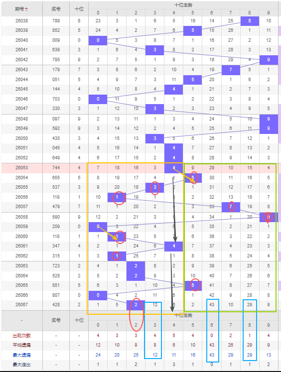 那么奇偶数方面:如图所示百位近15期开出奇数8期偶数7期,开出偶数的概率比开出奇数的概率要小一些,近五期中有三期开出了偶数号,那么本次考虑百位的趋势会继续增加偶数号,那么本期百位数看好偶数。偶数0号是百位遗漏期数较大的号,达到最大遗漏期数和平均遗漏数建议开出防冷号开出,6号同理。重号可以考虑继续开出4号。杀号建议定在奇数号,但是奇数09号都已经遗漏了五十余期之久是百位遗漏期数较大的号,达到最大遗漏期数且远超平均遗漏数建议开出防冷号开出。邻号也可以考虑开出3号。