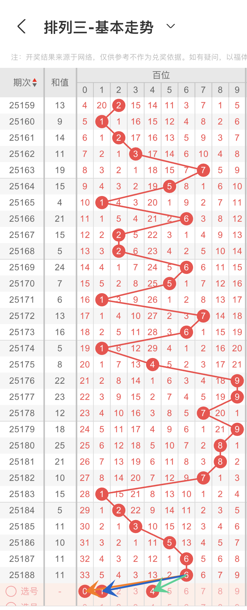 结合上面的大小、奇偶以及012路比,我们可以得到的数据分别是第一组01234,第二组02468,第3组147,我们重点选择3组数据中重复的,那百位我们选择4,防1路的1,0路的0,综上所述百位选014