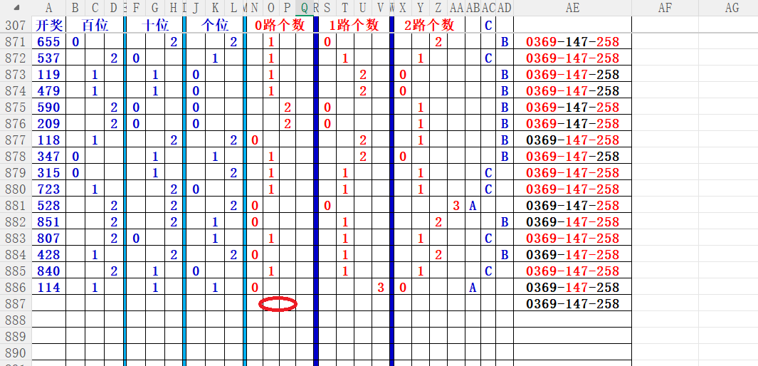 如上图56,012路分析0路出号的概率还是很大,本期可以从0路号入手做胆0369中选;看好369胆码。