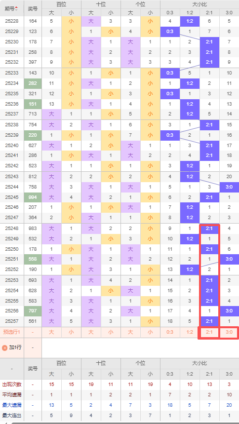 上期大小比:2:1,近10期大小比出现情况:2:1、1:2、2:1、3:0、1:2、2:1、2:1、2:1、3:0、2:1,最近10期出6期2:1,出现2期1:2,出现0期0:3,出现2期3:0,根据近10期出号规律本期看好大号,推荐连出2:1,防隔期开出3:0,综上所述大小比推荐:防:3:0,重点关注:2:1。