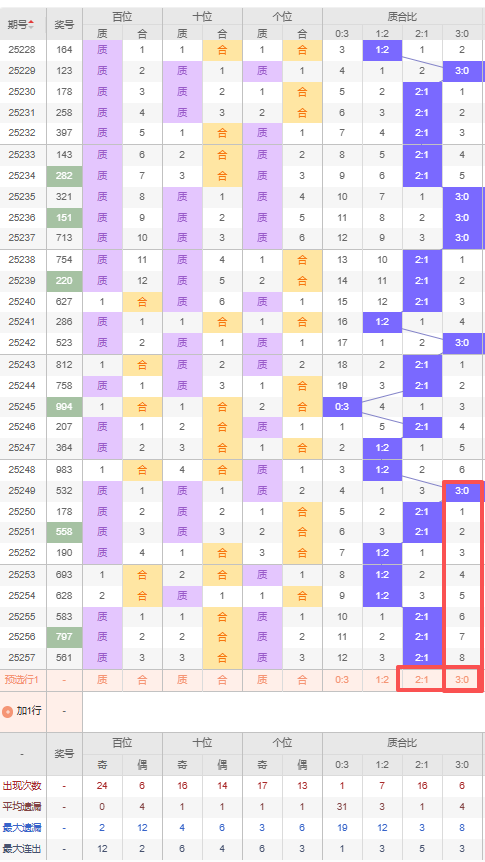上期质合比:2:1,近10期质合比出现情况:1:2、3:0、2:1、2:1、1:2、1:2、1:2、2:1、2:1、2:1,最近10期出现5期2:1,出现4期1:2,出现0期0:3,出现1期3:0,根据近10期规律本期看好质数,推荐遗漏8期的3:0,防四连出2:1,综上所述质合比推荐:防:2:1,重点关注:3:0。
