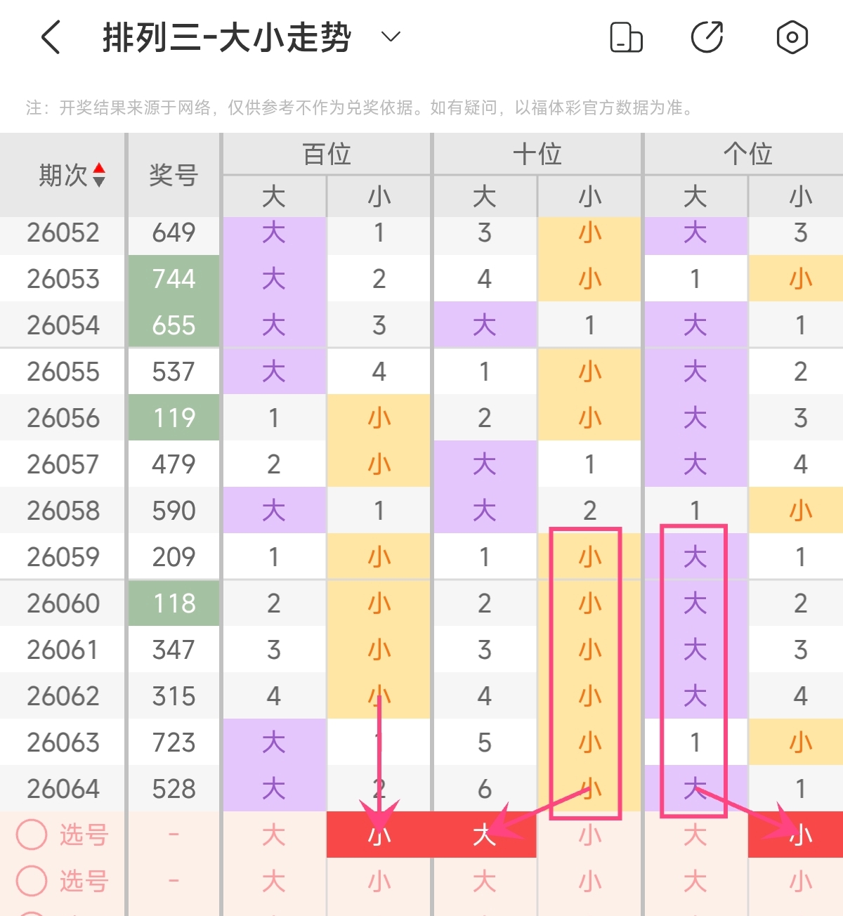 首先让我们回顾一下上期排列三第2026064期开奖号码为528,为组六形态,大小比为2:1,奇偶比为1:2,跨度为6,和值为15。
