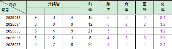 2025036期开奖号码521,我们可以看出近30期百位5出现3次,十位2出现5次,个位1出现2次。
